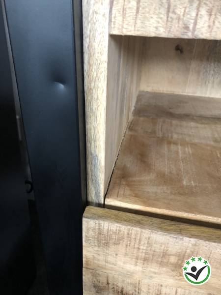 Alleen het dressoir van mangohout met metalen schuifdeuren zat in 1 deur een grote deuk en diverse kleine deuken.